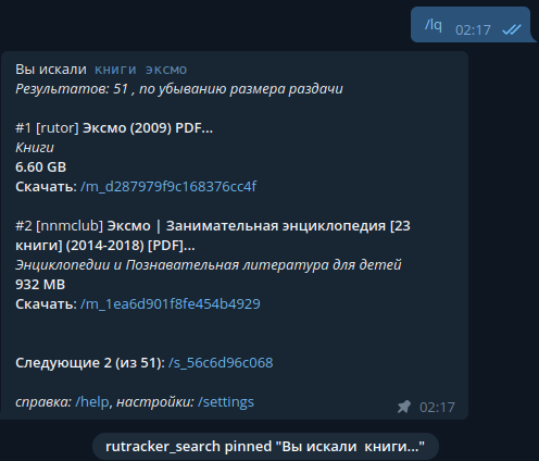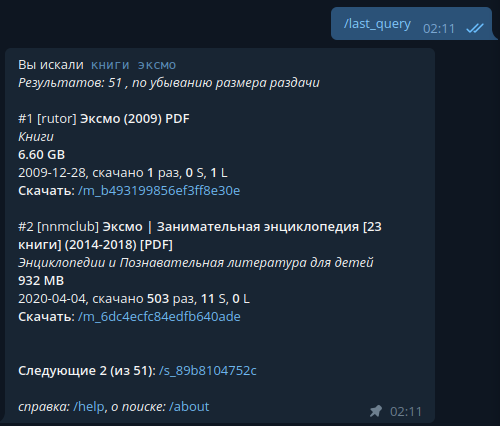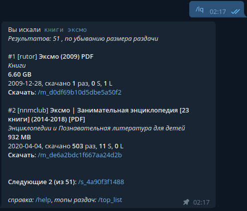 Таким образом, для получения нужной книги нужно написать боту сообщение и открыть несколько ссылок, чтобы выбрать результат, а далее поставить на загрузку в клиент и ждать, когда закончится загрузка.